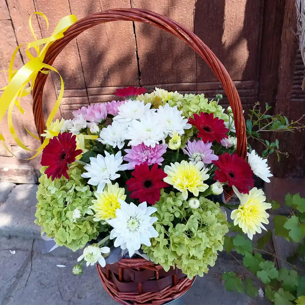 *Аранжирани на пиафлора в ратанова кошница с диаметър около 35 см